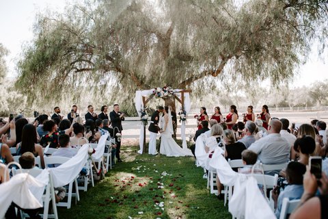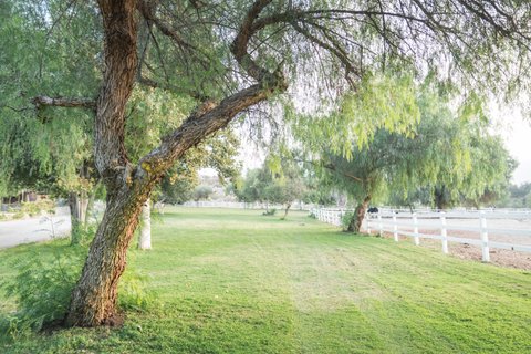 Our lawn features a wide-open grass setting surrounded by flower gardens, horse pastures, and rustic white fencing. Numerous Cottonwood, olive, and pepper trees encompass and drape the lawn. Vibrant, green tree foliage naturally serves as the perfect backdrop for any photo. Golden hour leads to the most breathtaking views of desert sunsets while dusk gives way to the twinkling of desert stars.